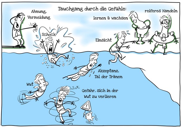 Der hier abgebildete Prozess ähnelt dem klassischen Trauerprozess bei Verlust und Abschied: Die erste Ahnung, dass da was lauert, auf die die Konfrontation mit den gefürchteten Fakten folgt.