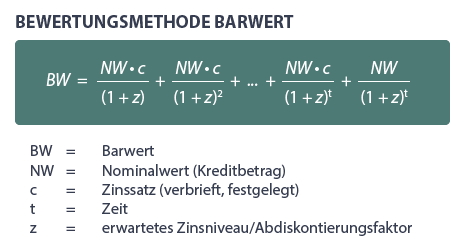Ermitteln Sie einmal selbst den Barwert eines Schuldscheins über 2,5 Mio. € mit einer Laufzeit von 15 Jahren ohne Tilgungszahlungen. Der Zinssatz beträgt 5%, das Zinsniveau liegt allerdings bei 3%.