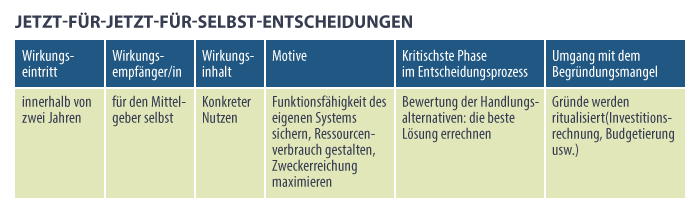 In dem Maße, in dem Unternehmen auch ihre Investitionsentscheidungen mit einer sehr kurzen Amortisationsfrist versehen, werden auch diese zu Jetzt-für-jetzt-Entscheidungen. Je näher das Jetzt der Wirkung an das Jetzt der Mittelauswahl herankommt, umso besser sind die Wirkungen in der Zukunft auch absehbar. Die zunehmende Dynamik, die Unternehmen schaffen und denen sie ausgesetzt sind, äußert sich im Entscheidungsprozess darin, dass selbst in einem zweijährigen Wirkungsprozess so viele Störungen auftreten können, dass die kalkulierte Wirkung später oder in vermindertem Ausmaß auftritt: