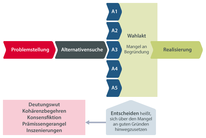 Wenn Handlungsalternativen gleichwertig oder vergleichbar sind, sind wirkliche Entscheidungen nötig! Dann kommt im Moment des Wahlaktes, des Schnittes in die Welt, zwangsläufig ein Moment der Willkür und des Dezisionismus (Ortmann (2011): Die Kunst des Entscheidens. Weilerswist, S. 21).